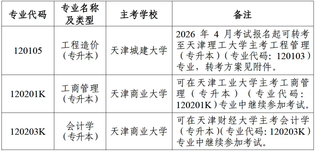 为适应经济社会发展需求,优化我市高等教育自学考试资源配置和学科专业设置,根据《市考委关于印发〈天津市高等教育自学考试专业管理办法〉的通知》(津考委高发〔2022〕1号)相关规定,结合本市具体实际和有关主考学校申请,决定停考工程造价((专本本)等3个专业,停考专业自2026年4月考试报名起不再接收新考生,自2028年起停止安排考试、停办毕业证。具体事项通知如下:
